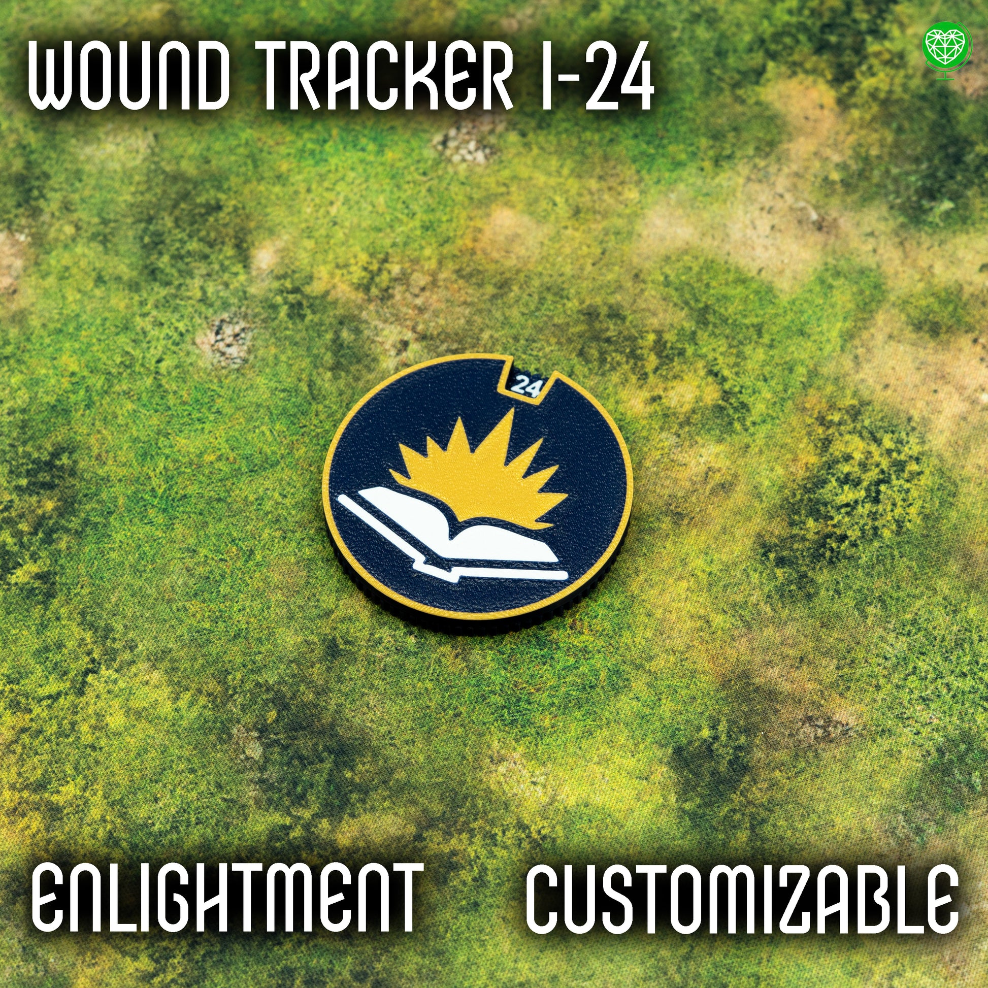 Enhance your tabletop gaming experience with this uniquely crafted wound tracker, designed to keep precise count of up to 24 wounds with customizable colors inspired by the striking Enlightment style visible in the listing image. This accessory stands out by combining function and thematic flair, ensuring your gameplay remains immersive and organized without the hassle of tallying wounds manually or by using dices.